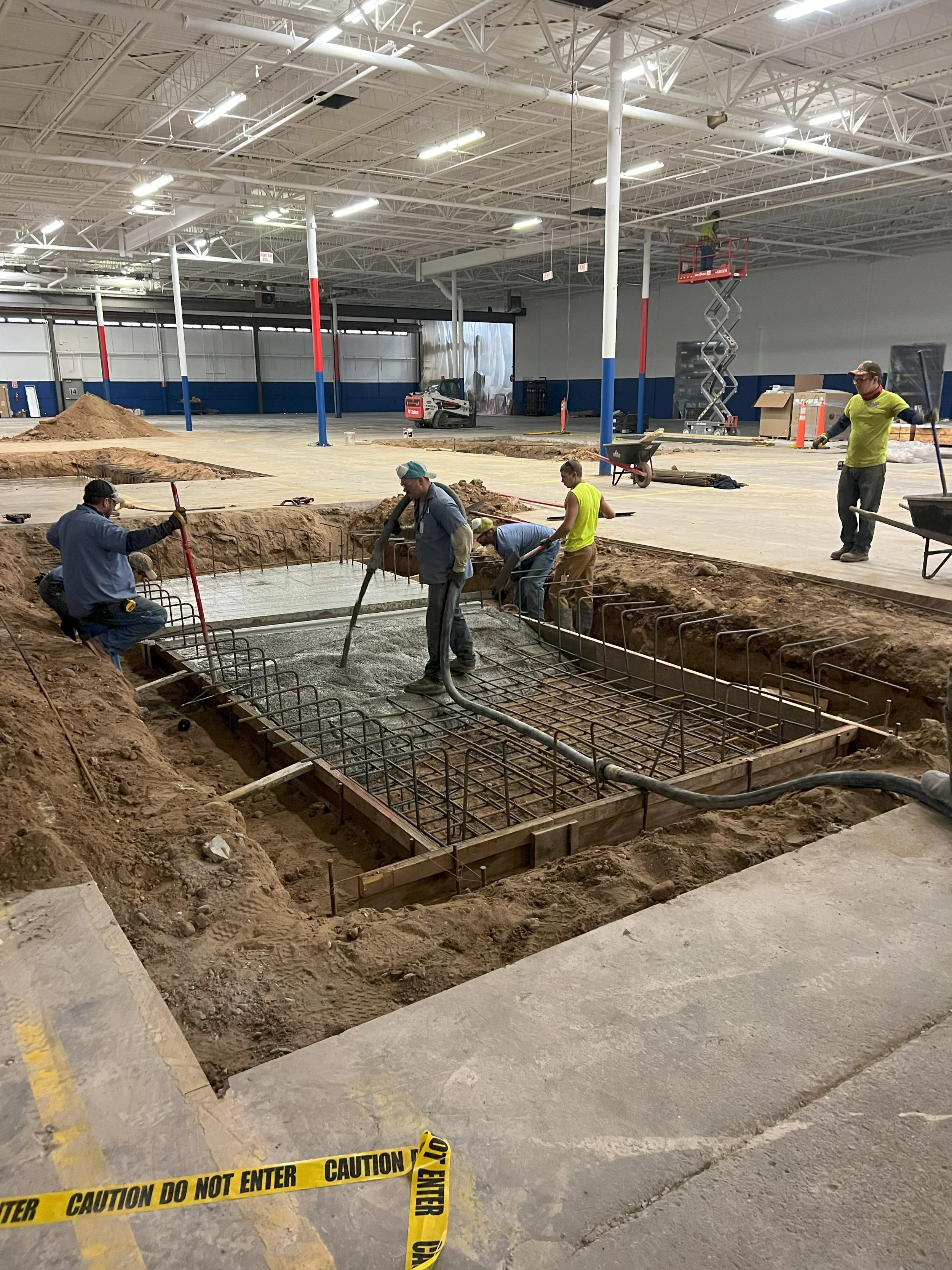 The scope of work includes the removal and replacement of two substantial sections of concrete flooring, each measuring 12.5 feet by 28 feet. These areas were excavated to depths of 39 inches and 20 inches, respectively, to accommodate new structural foundations.